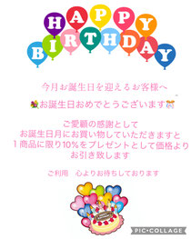 当店よりお誕生日プレゼントとして、お誕生月にお買い物をしていただきますと一商品に限り10%OFFのサービ スをご用意しております。